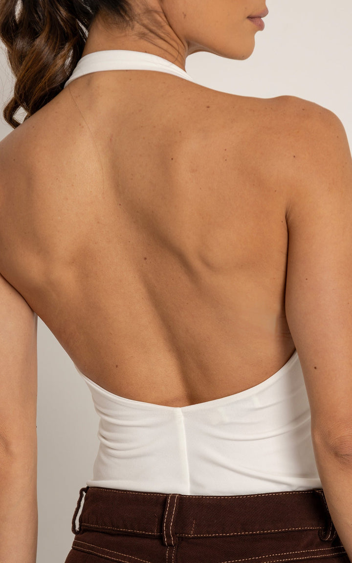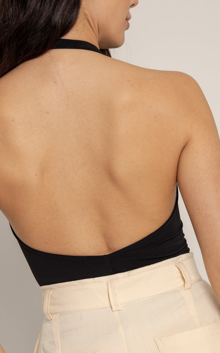 El amarre posterior en el cuello permite un ajuste personalizado, adaptándose a diferentes tipos de cuerpo. Confeccionada en una tela suave, fresca y con caída natural, es una pieza infalible para elevar cualquier outfit básico.
