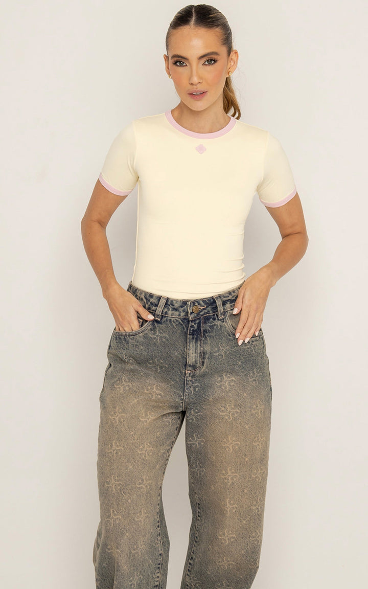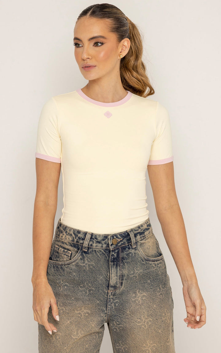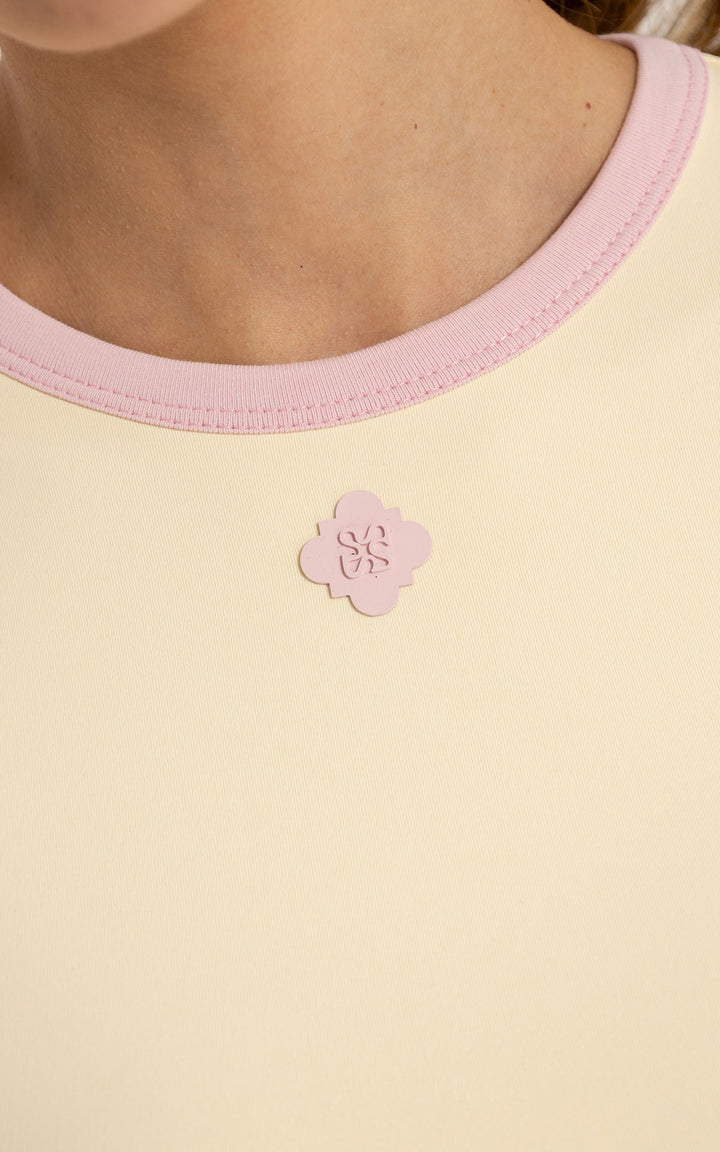 Diseño: Silueta ajustada con cuello redondo, manga corta y Aplique decorativo en forma de flor con logo al centro.