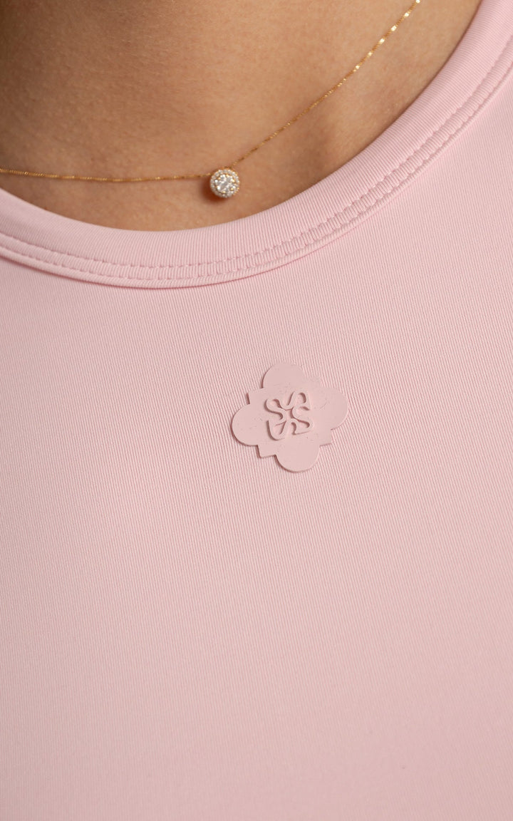 Diseño: Silueta ajustada con cuello redondo, manga corta y Aplique decorativo en forma de flor con logo al centro.