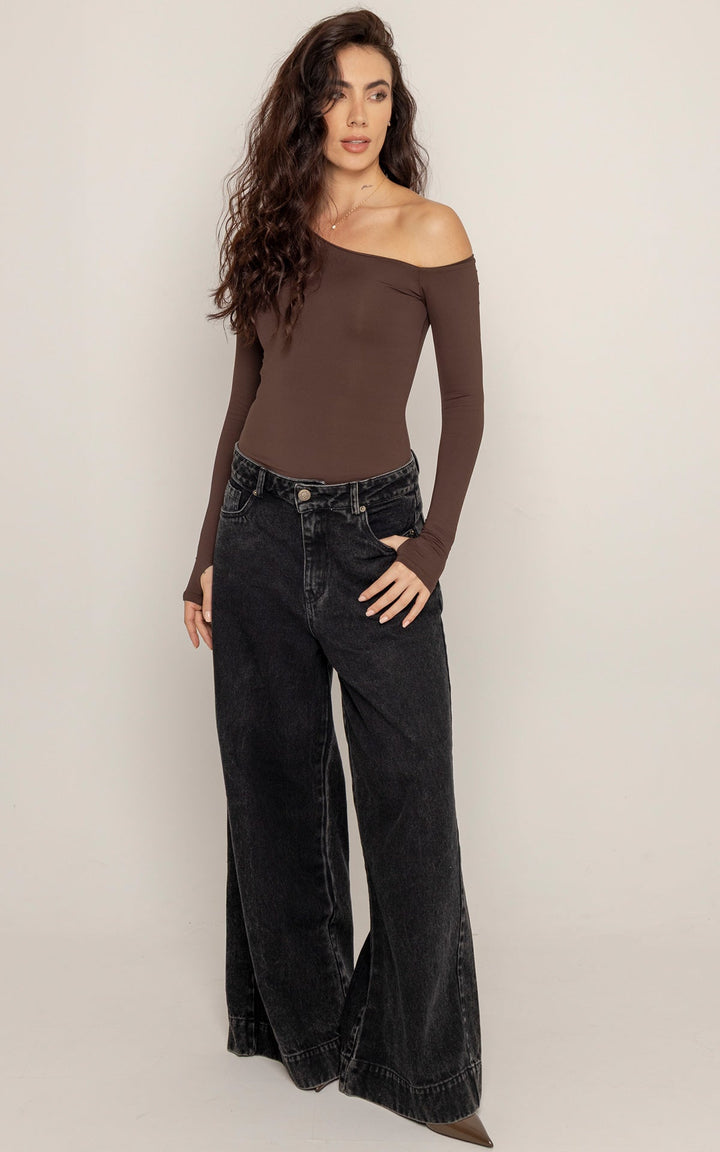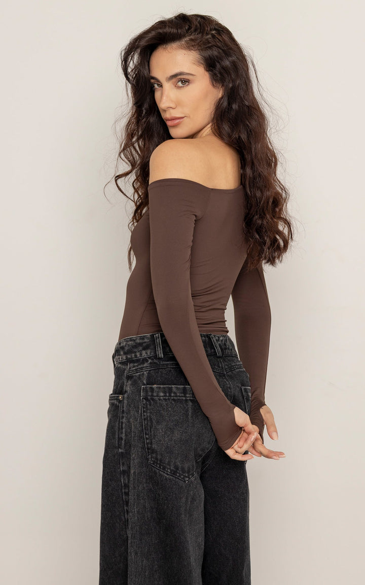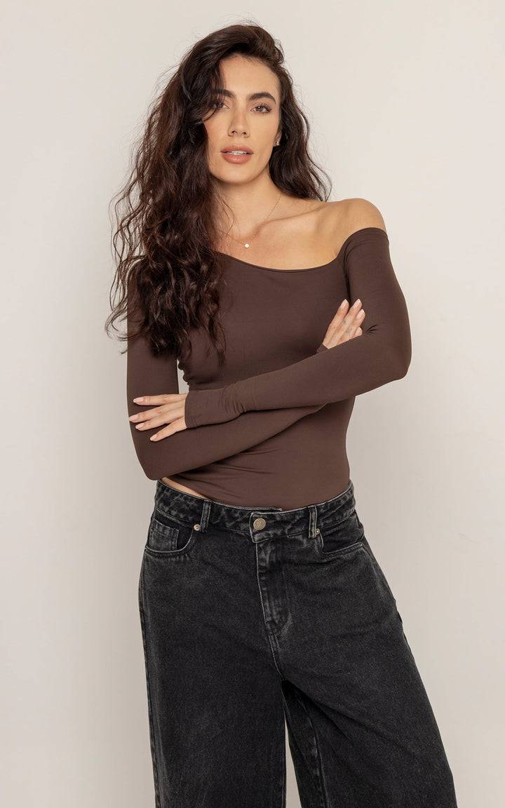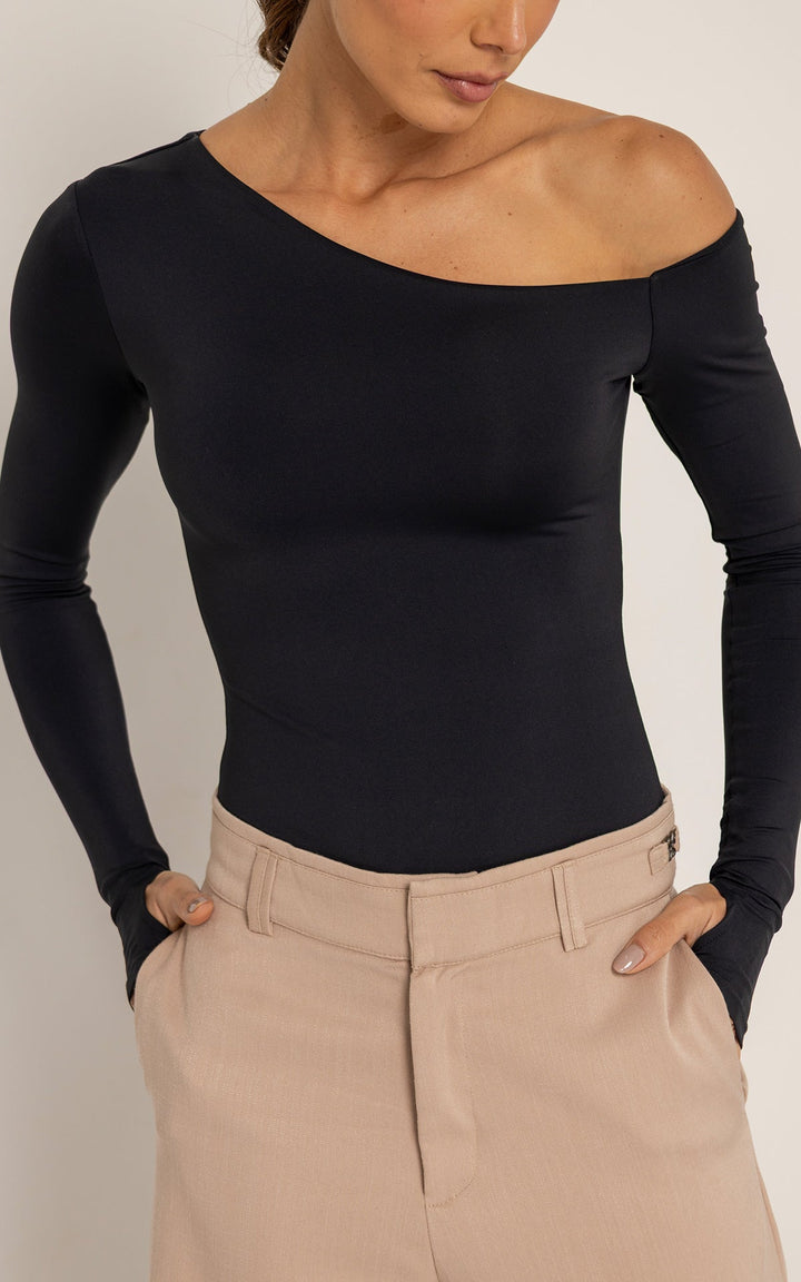 Confeccionado en una tela elástica de tacto suave, se adapta perfectamente al cuerpo brindando confort y estructura. Las mangas largas equilibran el diseño, haciendo de este body una opción versátil tanto para el día como para la noche.