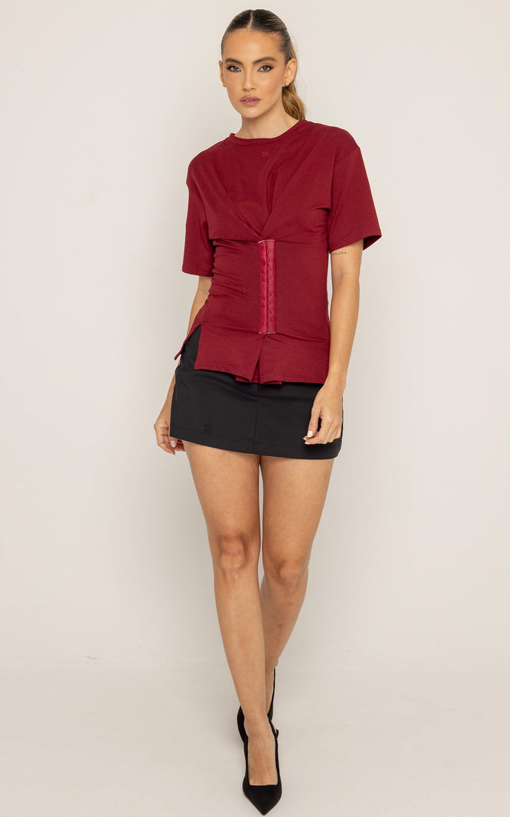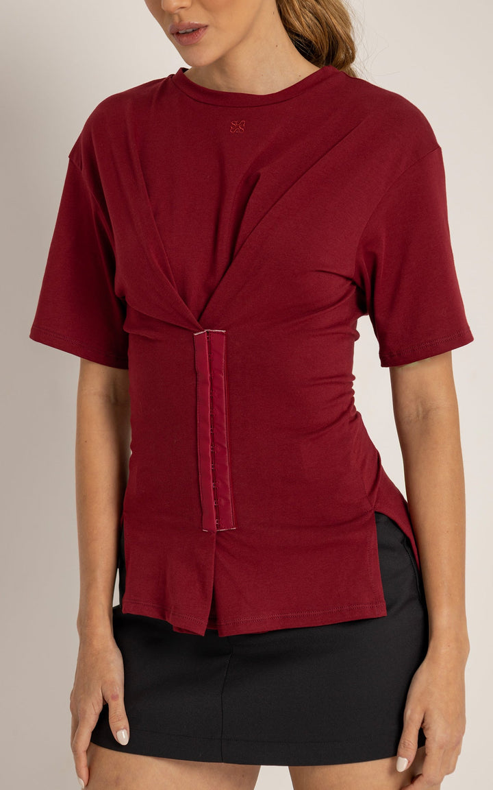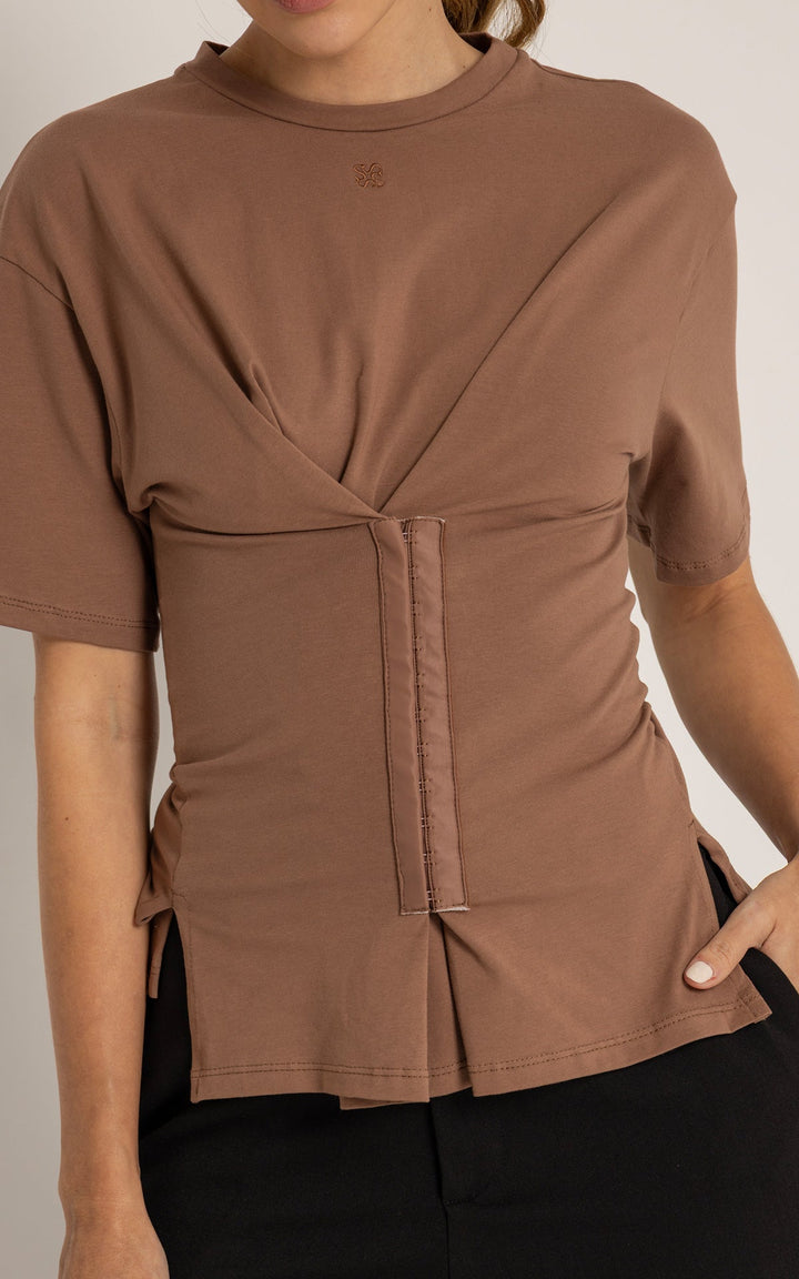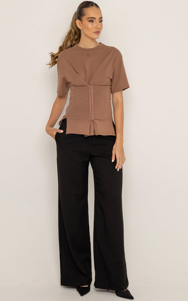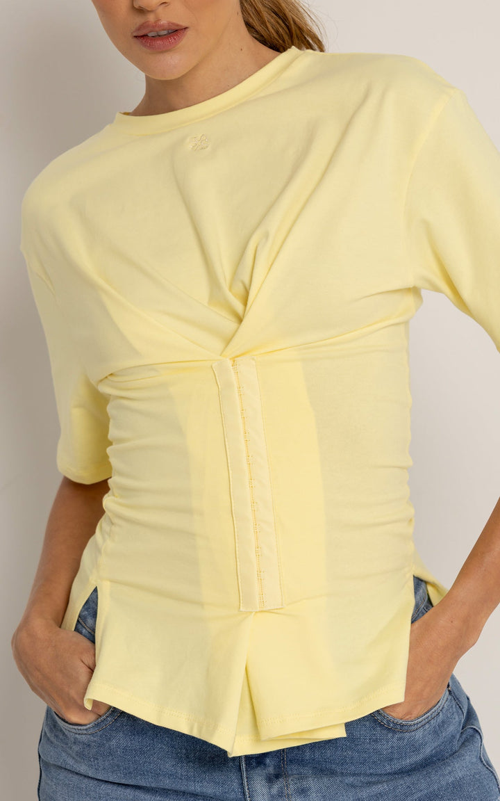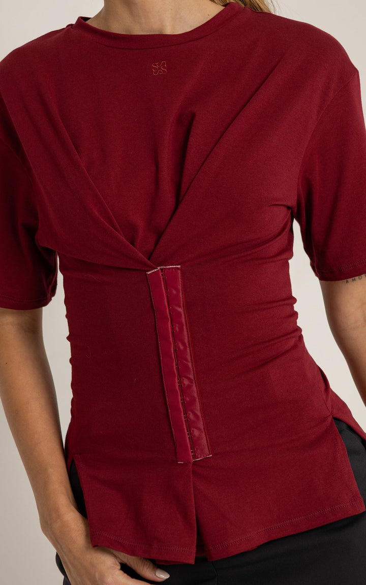 • Diseño: T-shirt con broches en la parte delantera y trasera, que crean un efecto corset ajustable y estilizado.