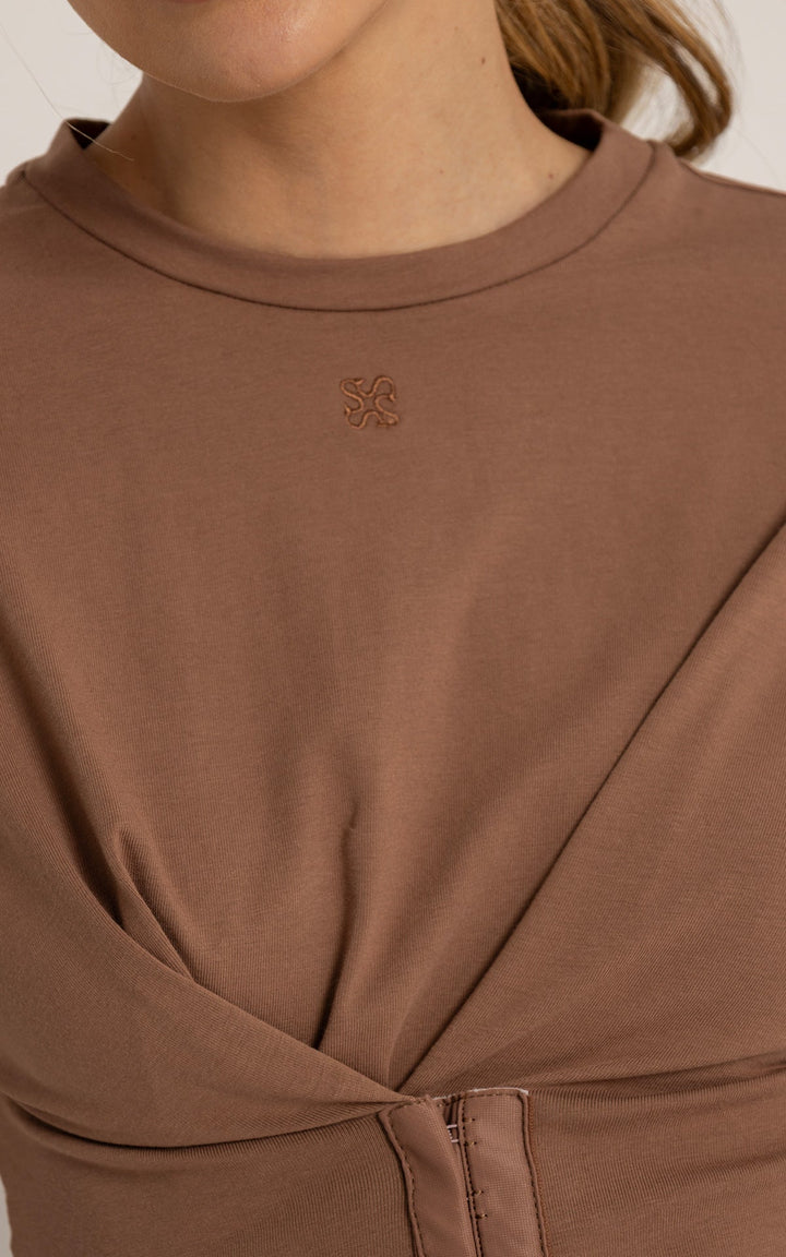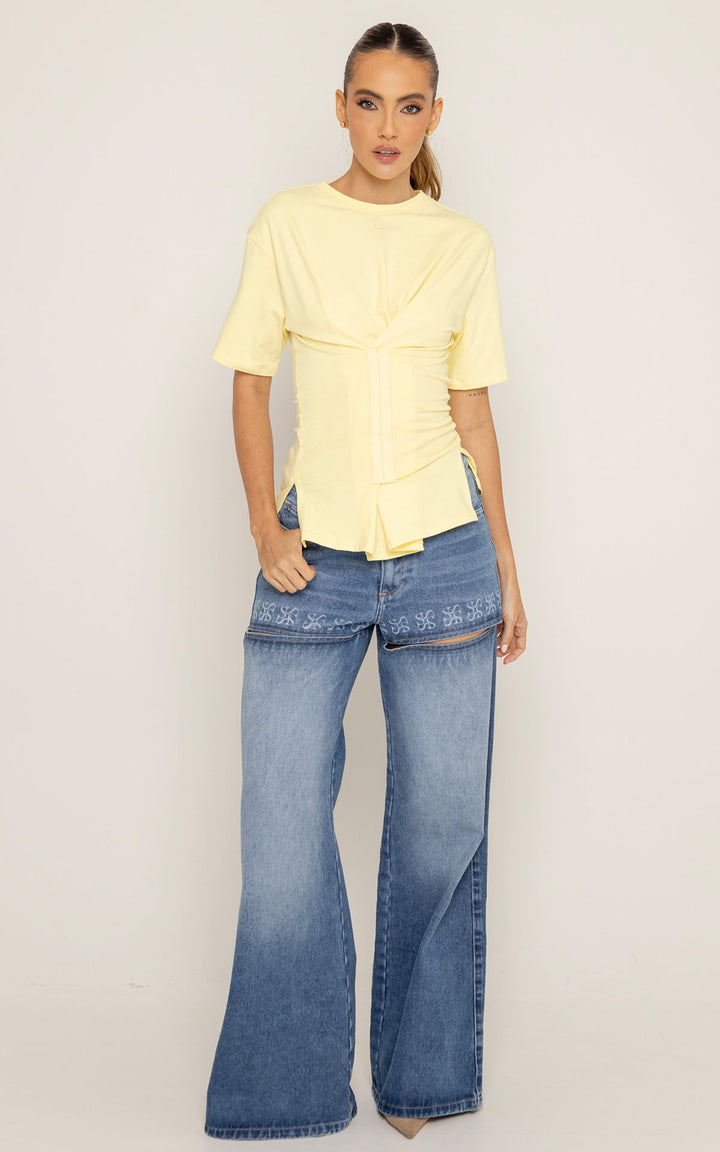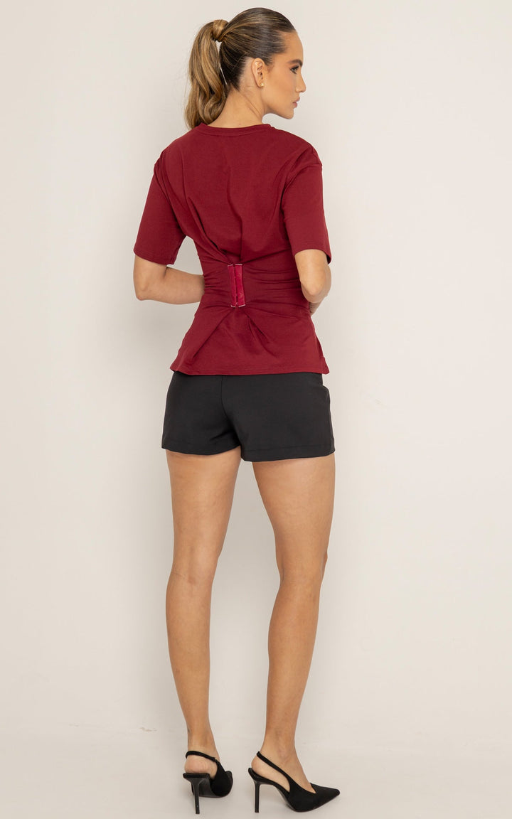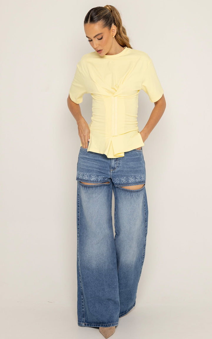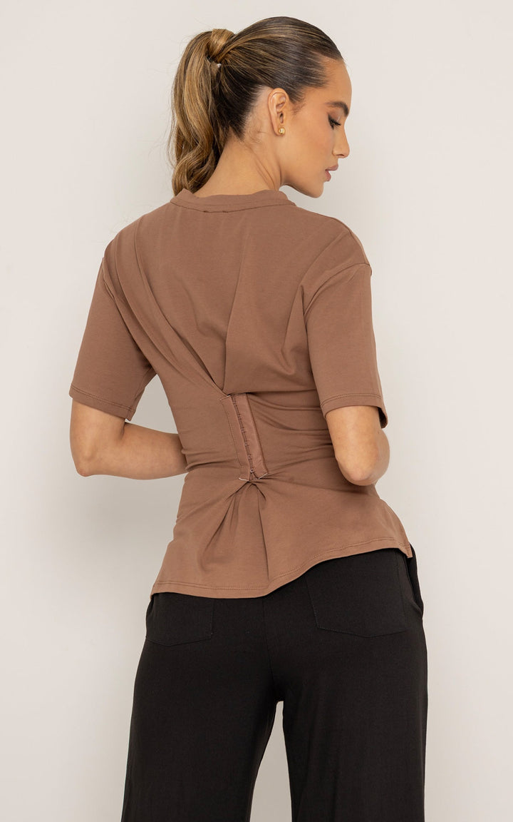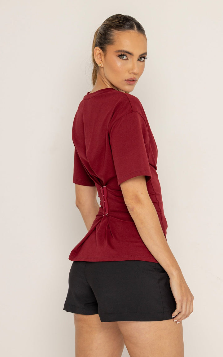 • Diseño: T-shirt con broches en la parte delantera y trasera, que crean un efecto corset ajustable y estilizado.