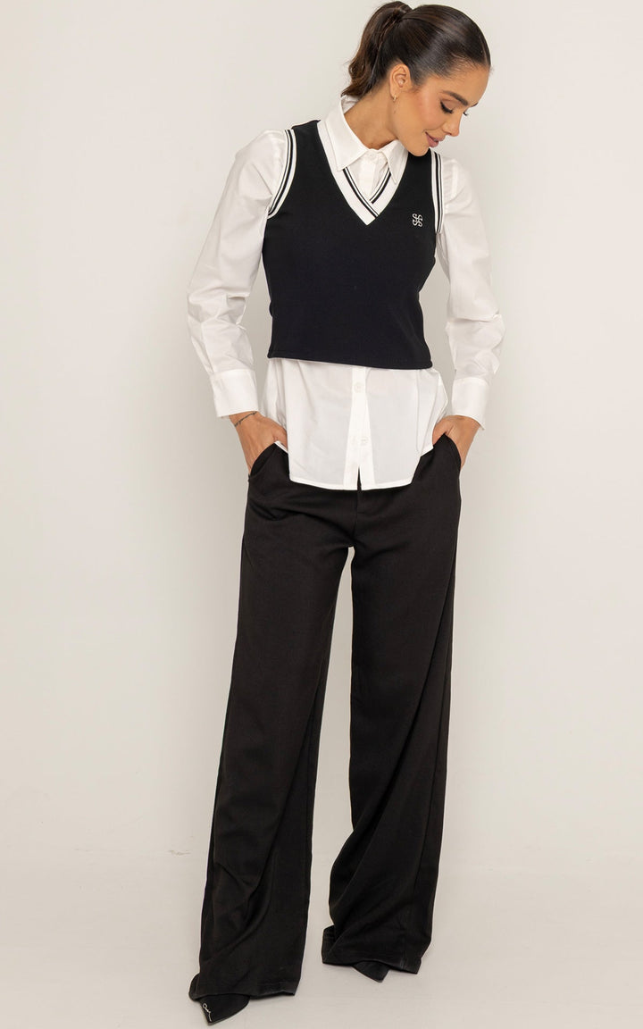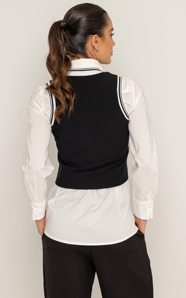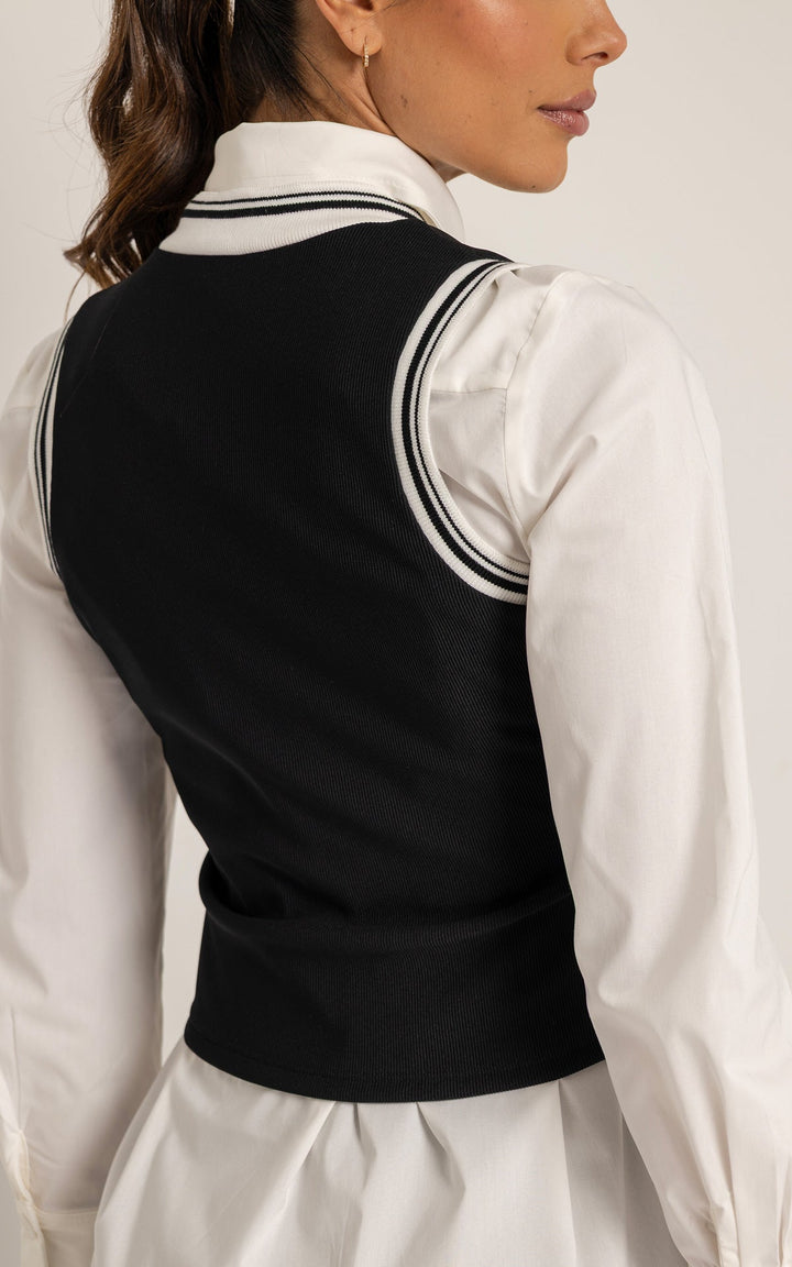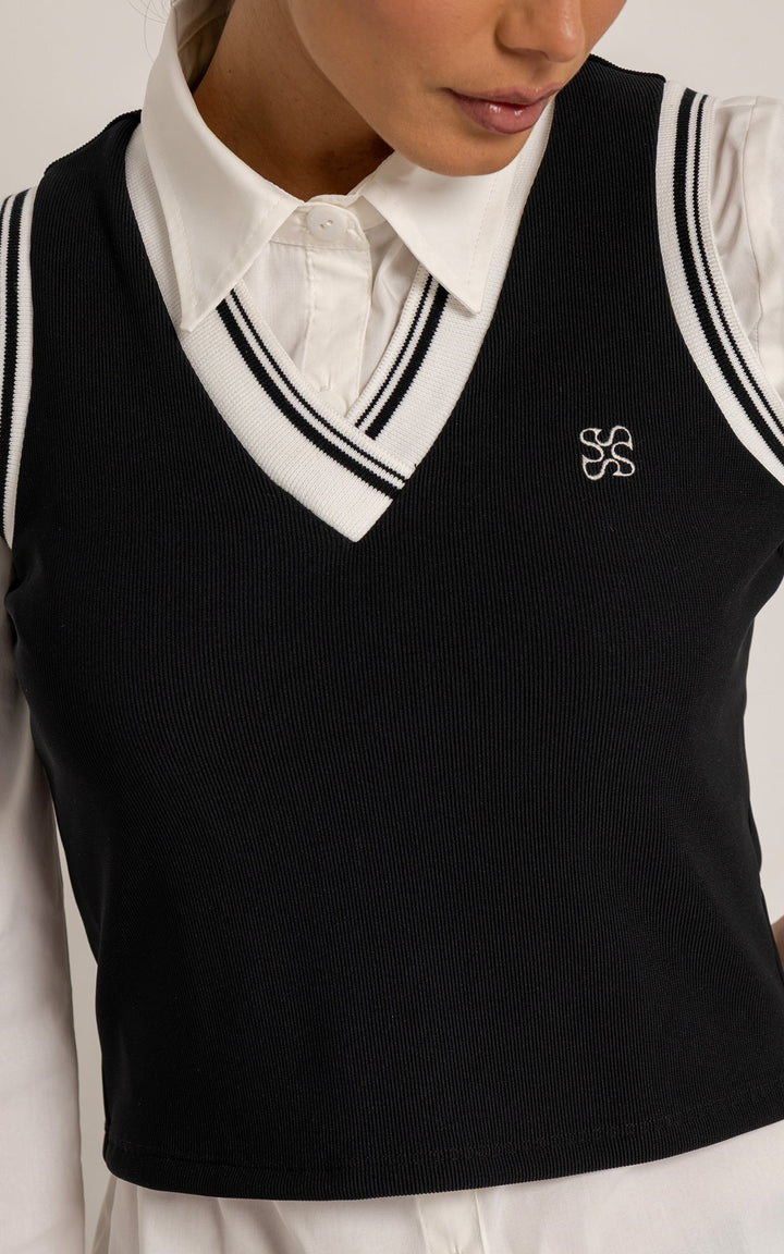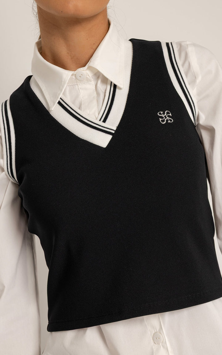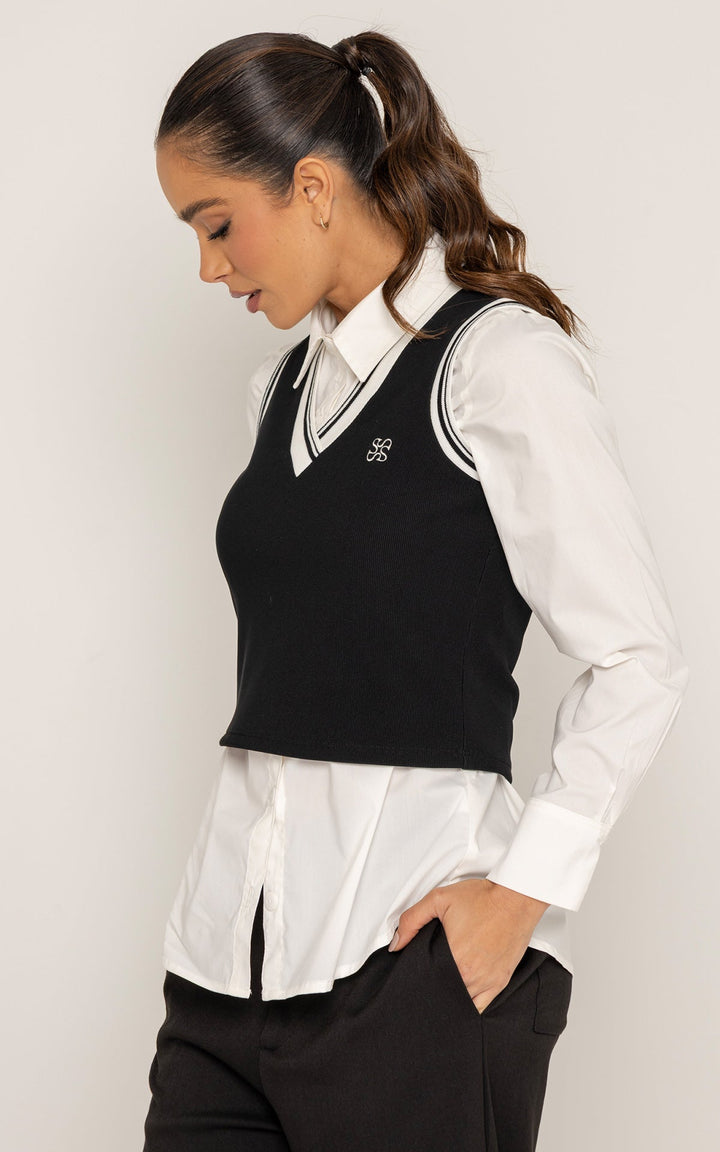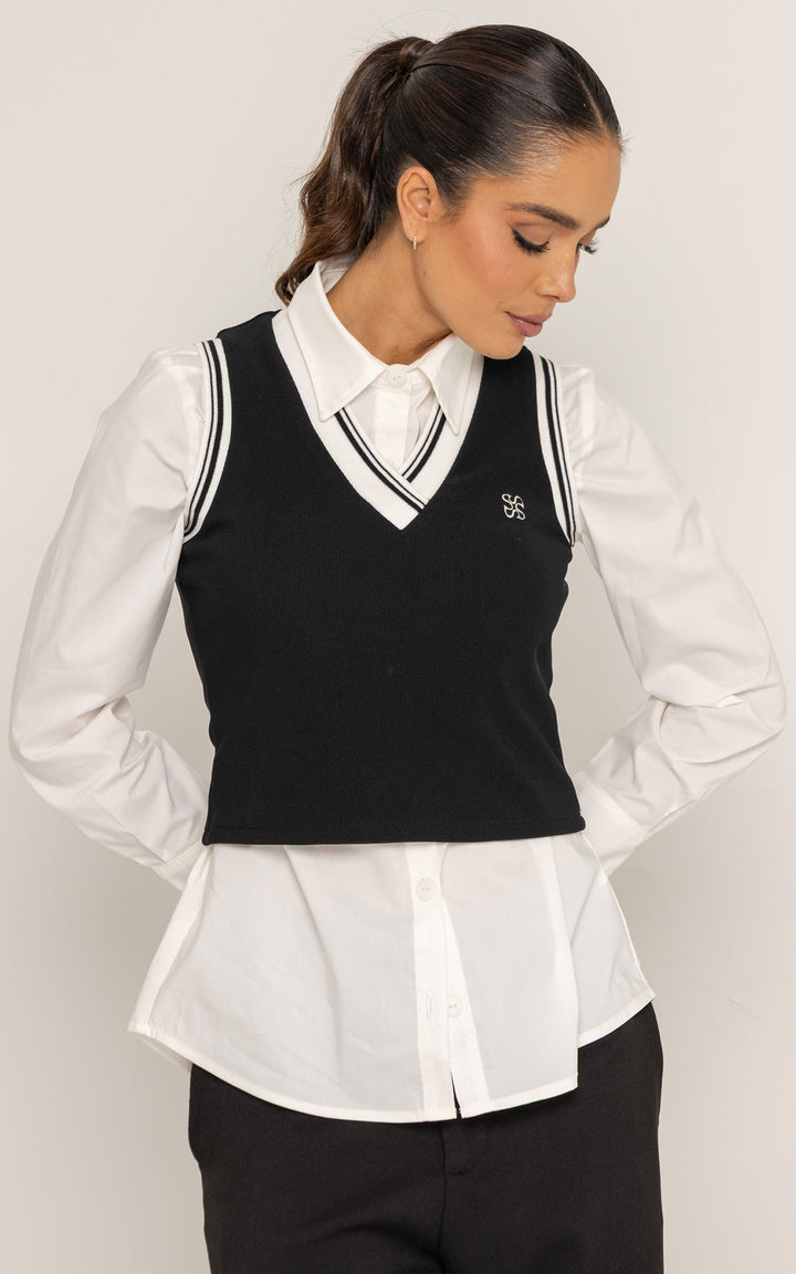 Perfecto para layering, es ideal para combinar sobre camisas, tops o vestidos, creando looks versátiles y sofisticados con un aire colegial actualizado.
