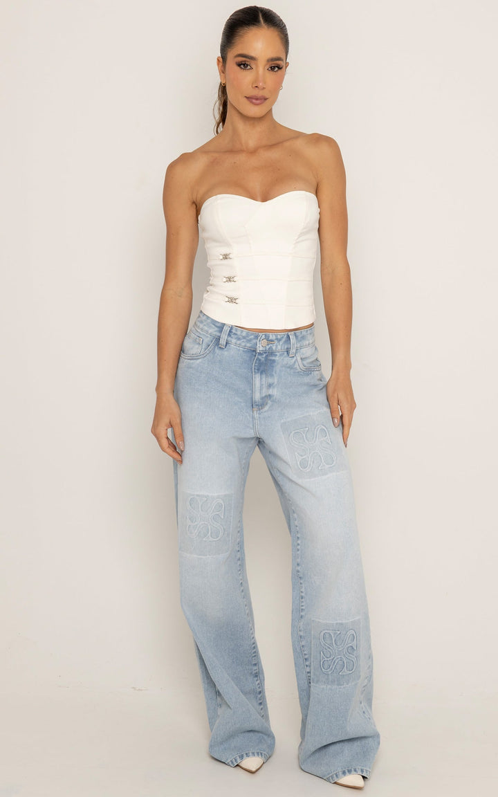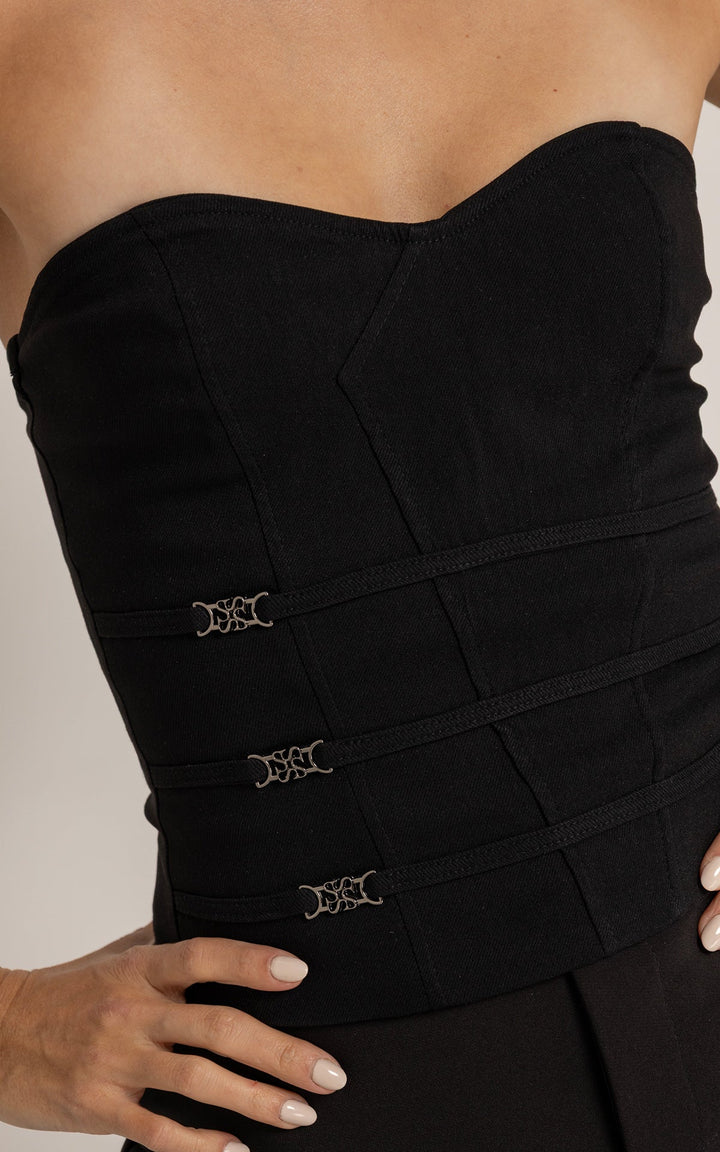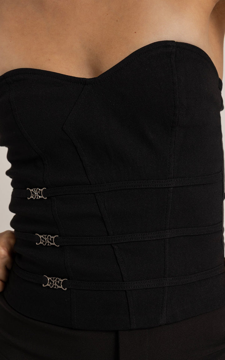 El Corset Lush es una declaración de sofisticación con carácter. Su diseño strapless, de silueta estructurada, resalta la figura mientras que los tres herrajes metálicos con el monograma de la colección lo convierten en una pieza insignia. Hecho en tela de estructura media que se adapta al cuerpo sin perder forma. Perfecto para elevar un look con jeans o llevar con la Faldashort Alessia para un set ganador. Disponible en negro y marfil.