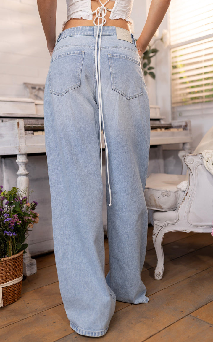 Diseño: Jean de tiro medio con bota ancha, abertura sobre los muslos y detalles de logo en láser en contraste.