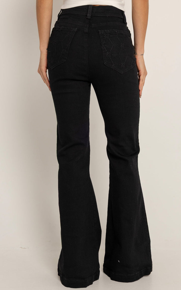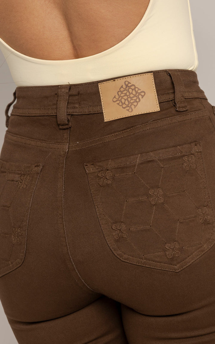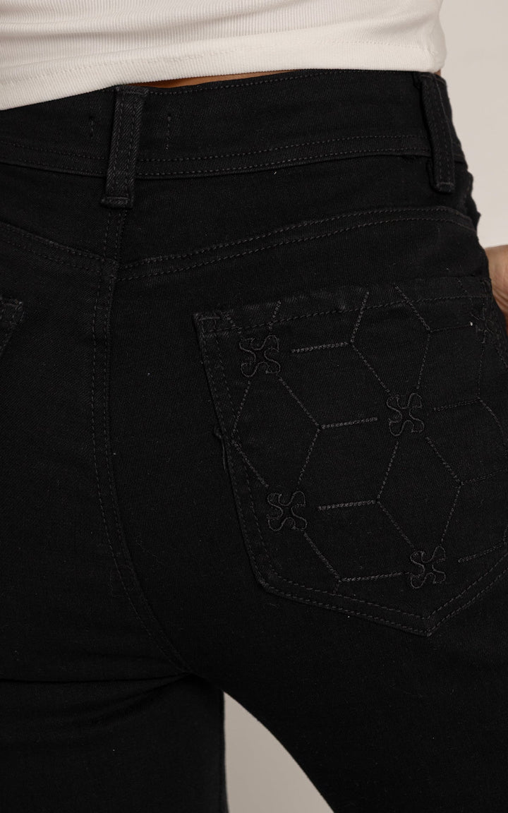 Destaca por su bordado exclusivo en los bolsillos traseros, con motivos geométricos y logotipo integrado, que elevan esta prenda básica a una pieza con carácter propio.