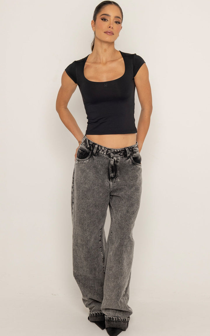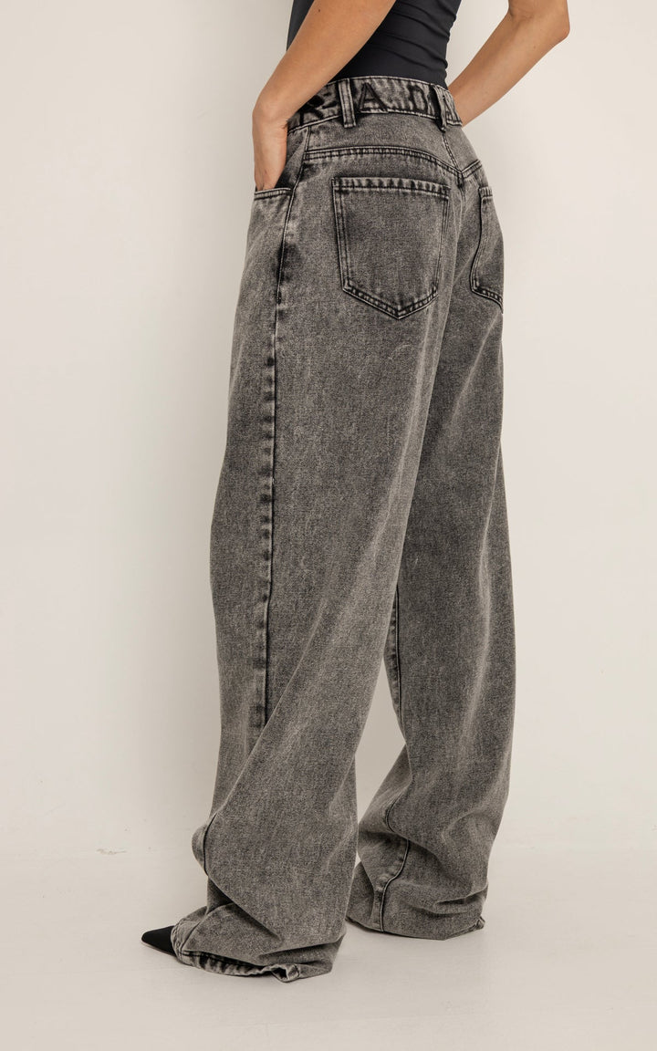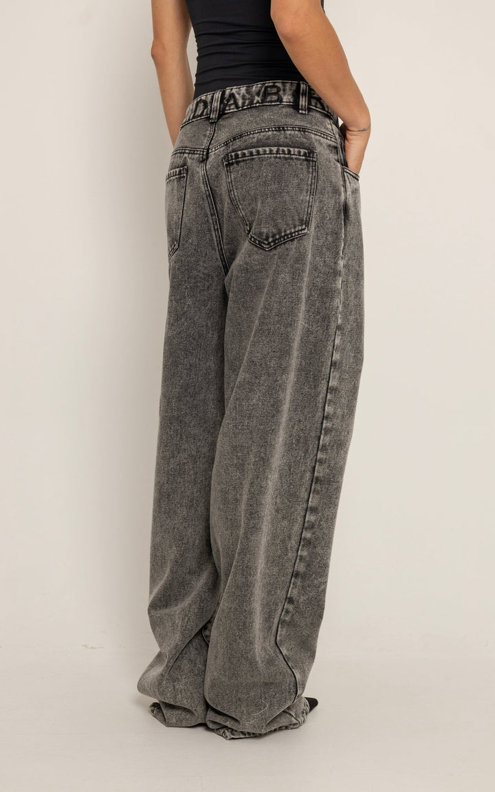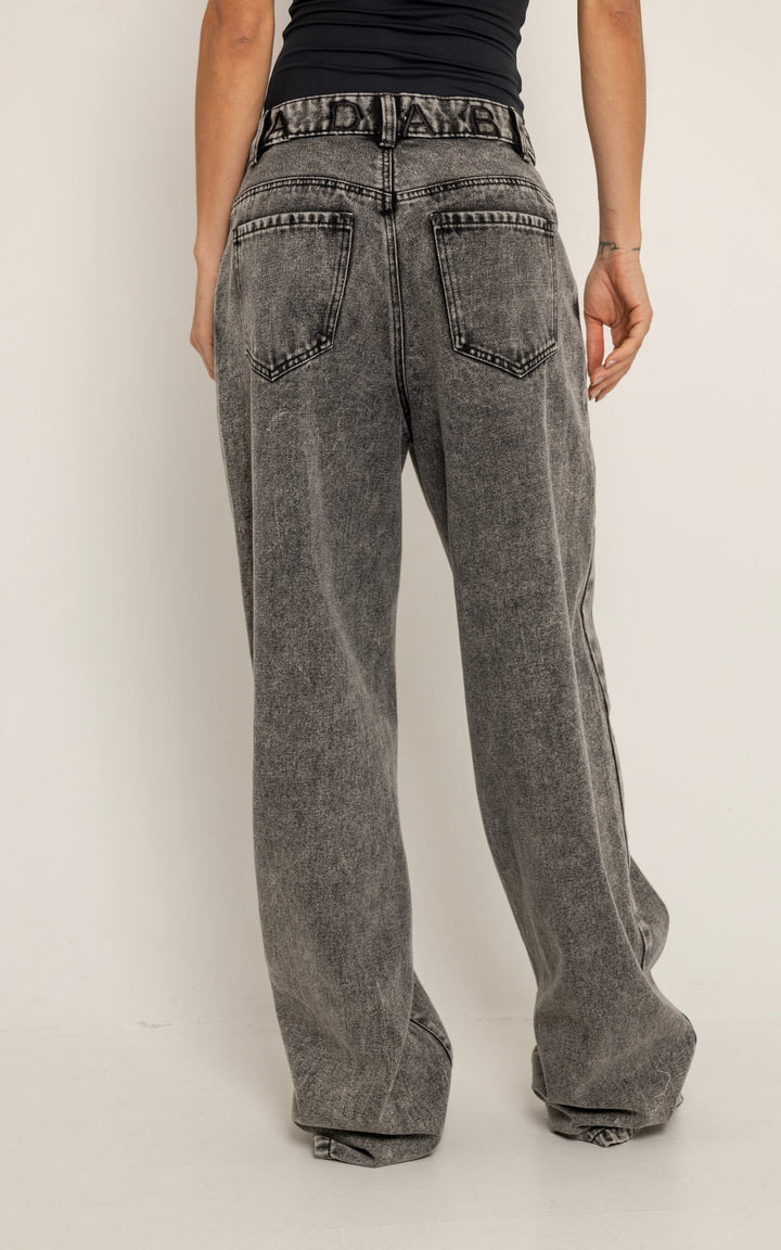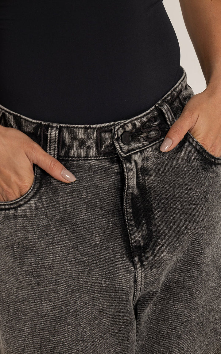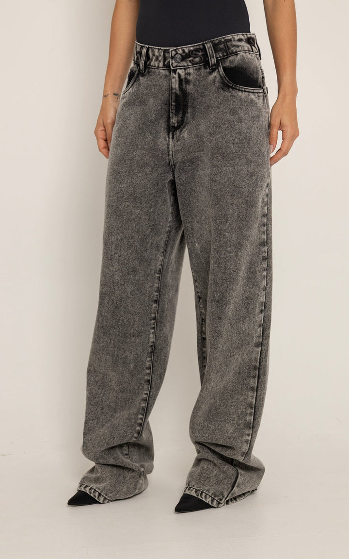 El Jean Ginny está confeccionado en denim 100 % algodón con acabado acid wash, logrando ese efecto jaspeado en azul claro que remite a los años noventa. Su silueta es recta y relajada, con tiro alto y bota ligeramente amplia que aporta estructura sin rigidez.
