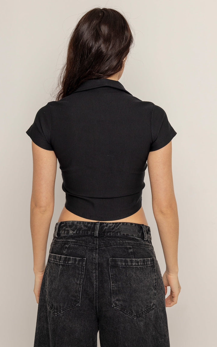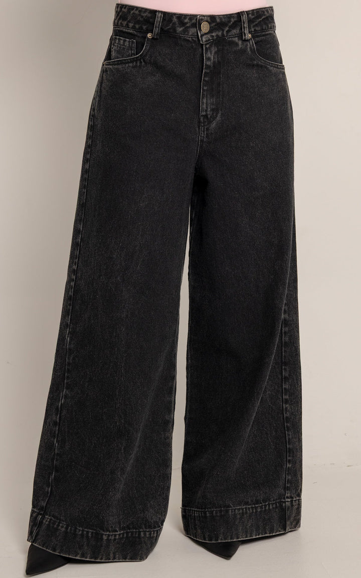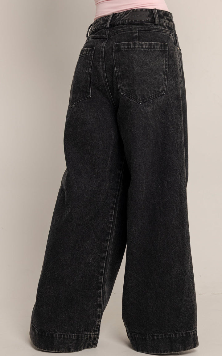 El Jean Ónix está confeccionado en denim 100 % algodón con acabado stone washed en tono negro desgastado, lo que le otorga carácter y textura visual. Su silueta wide leg extrema y tiro alto crean un efecto de elongación que estiliza sin perder comodidad.