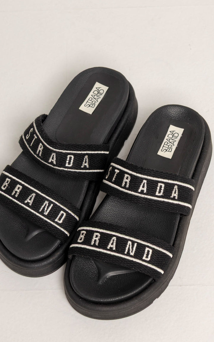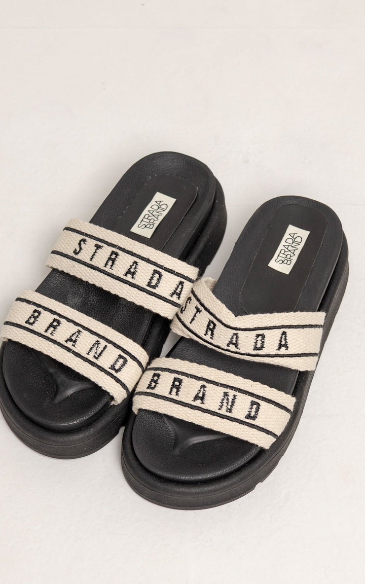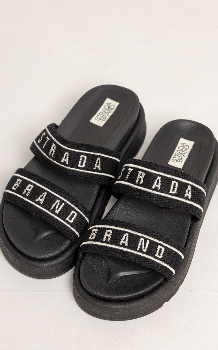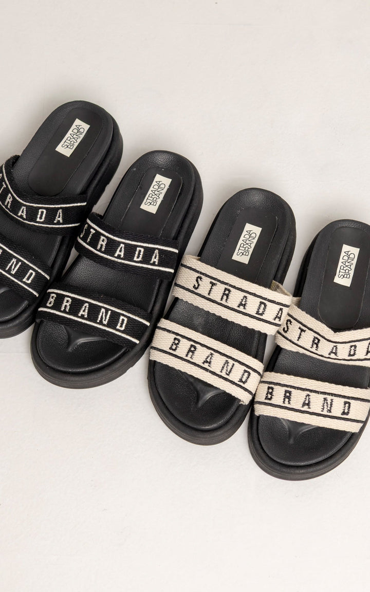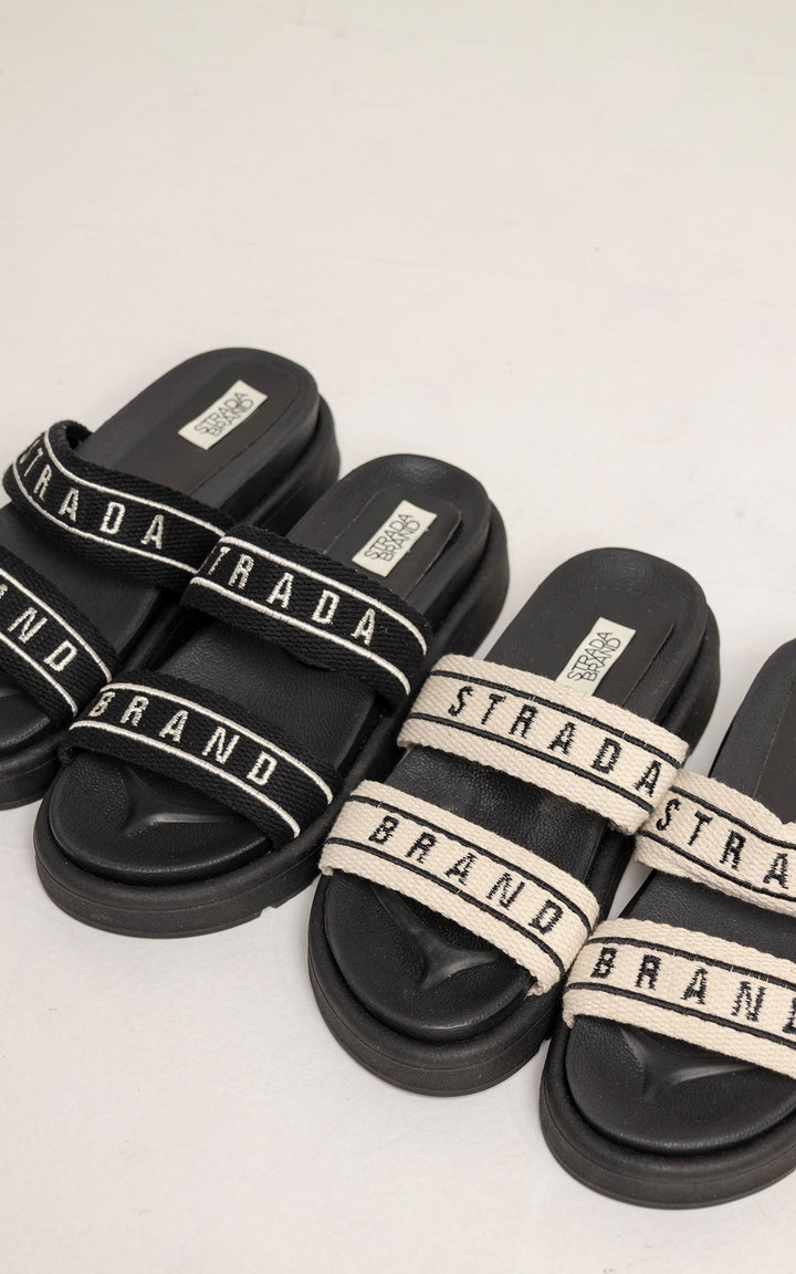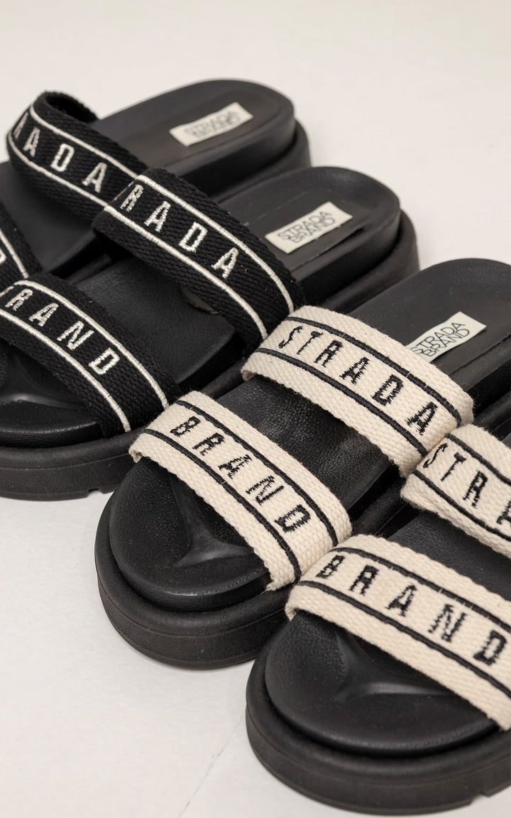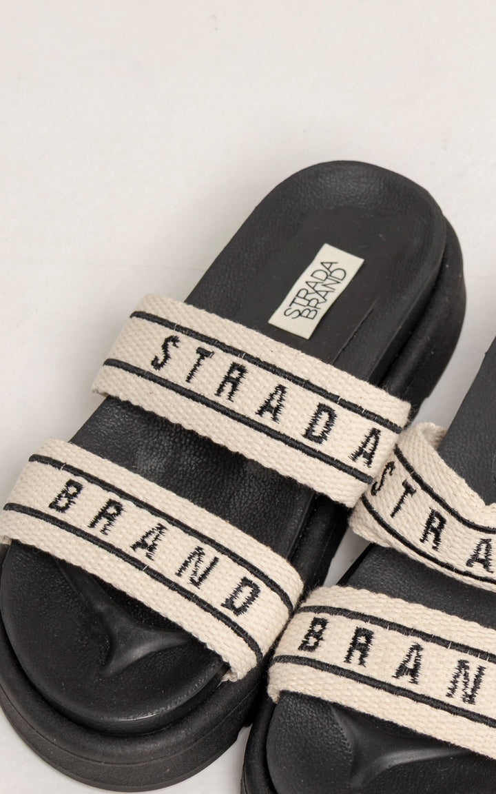 La Sandalia Janeiro se destaca por su diseño gráfico y contemporáneo. Su estructura cuenta con base acolchada de plataforma baja y dos tiras gruesas en lona con el logo STRADA BRAND tejido en contraste, que le dan un aire urbano y distintivo.