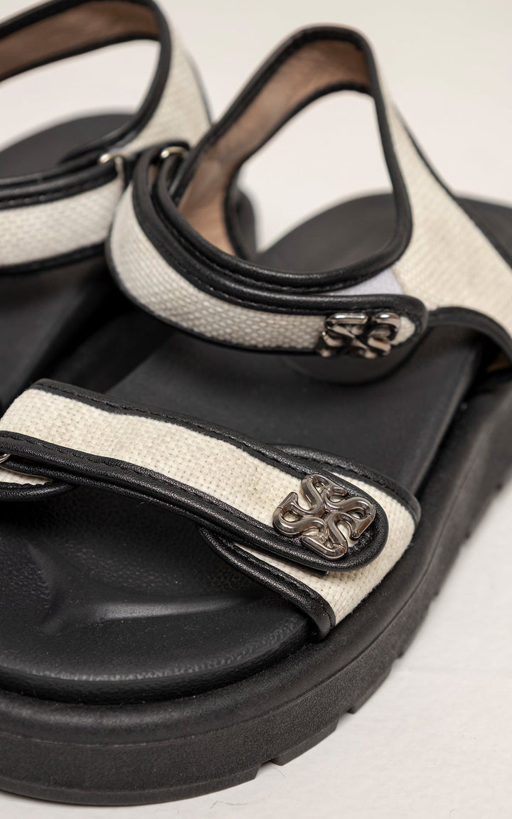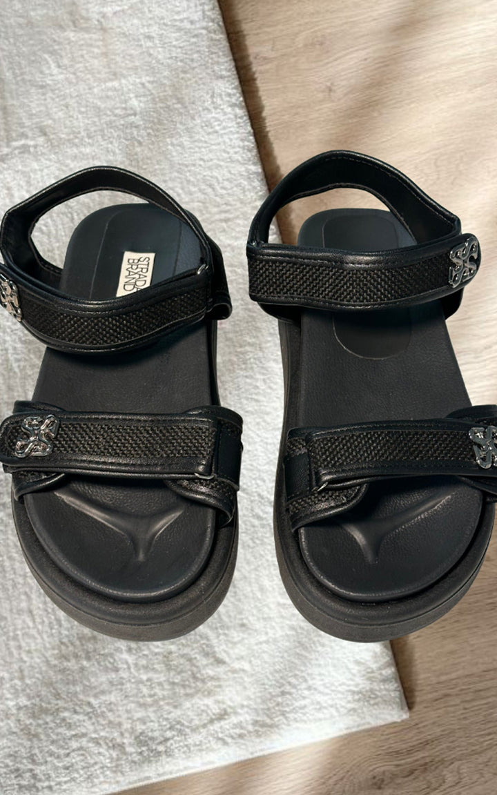 Cuenta con cierres en velcro para un calce fácil y detalle metálico con el logo en las correas, que refuerza su identidad de marca. La suela de goma liviana garantiza estabilidad al caminar, incluso en trayectos prolongados.