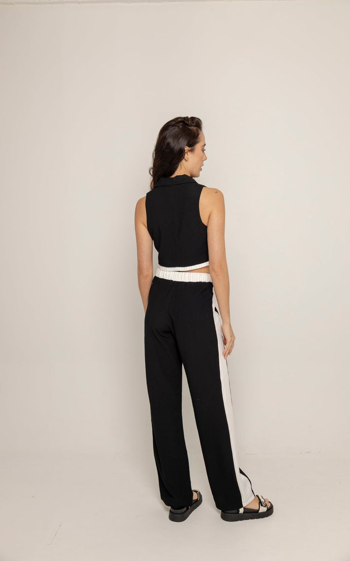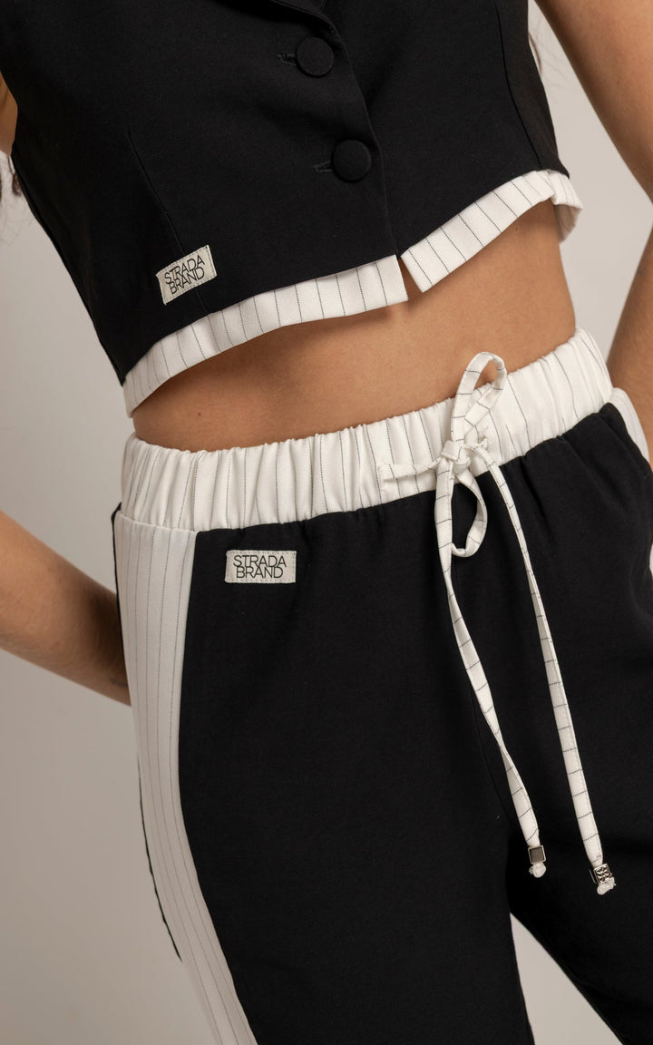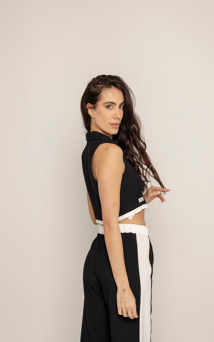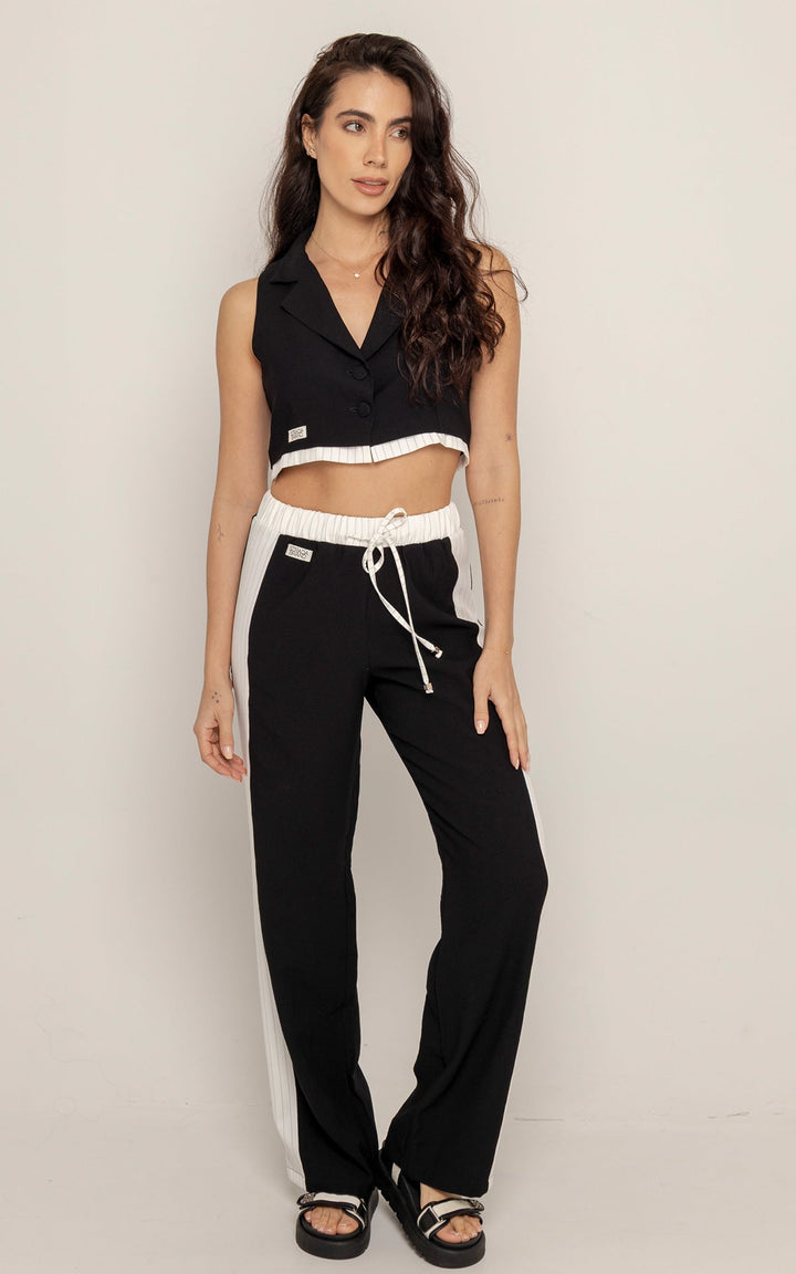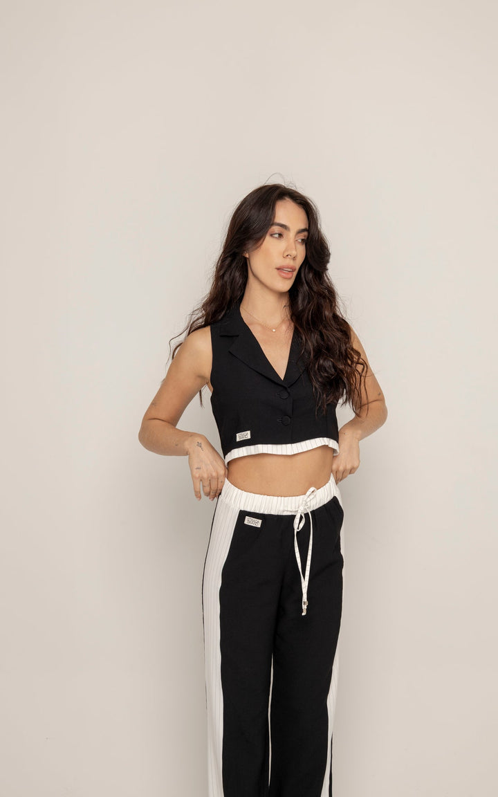 El Set Adela está compuesto por dos piezas: un chaleco tipo sastre sin mangas y un pantalón de silueta recta con pretina elástica y cordón ajustable. El top presenta cuello clásico, botones frontales y estructura entallada que realza el torso con un aire moderno. El pantalón, en contraste, incluye laterales en tono claro que estilizan visualmente la pierna y refuerzan la inspiración deportiva.