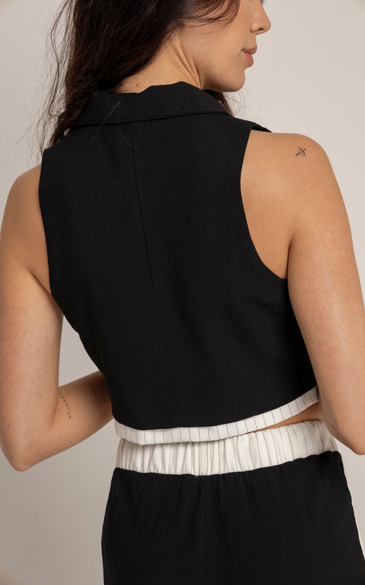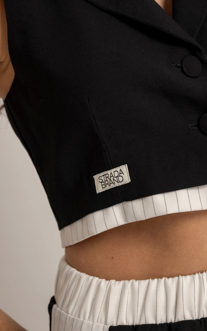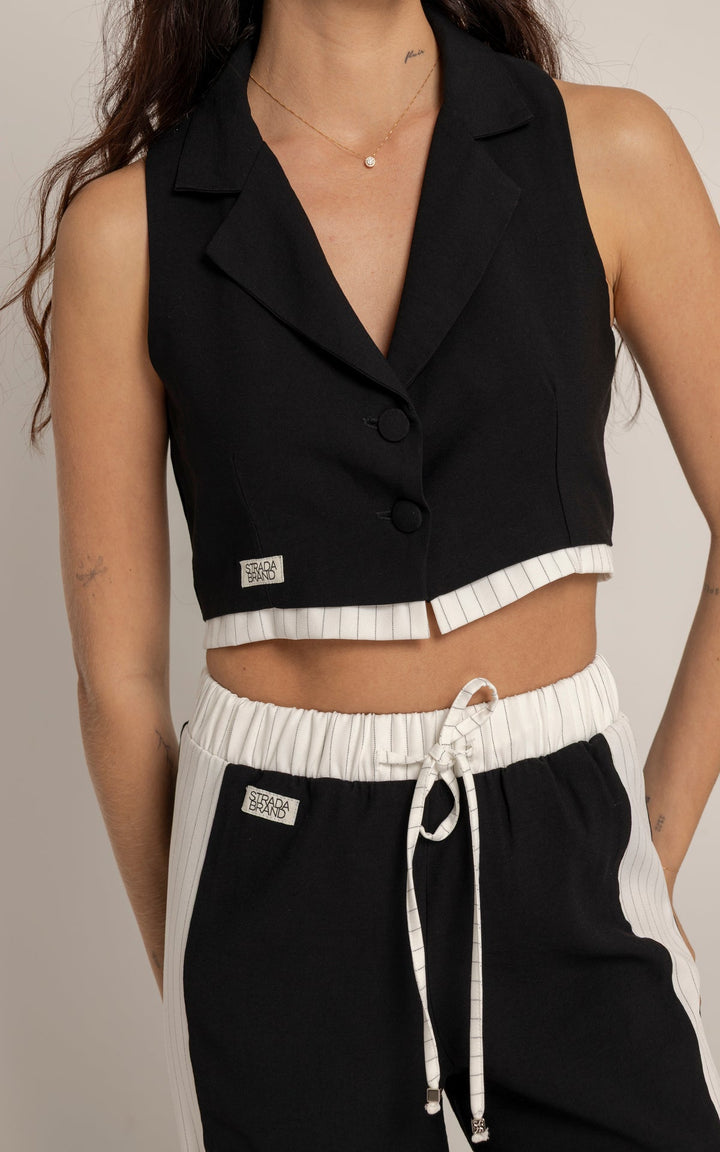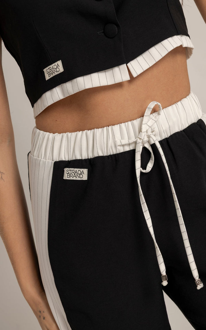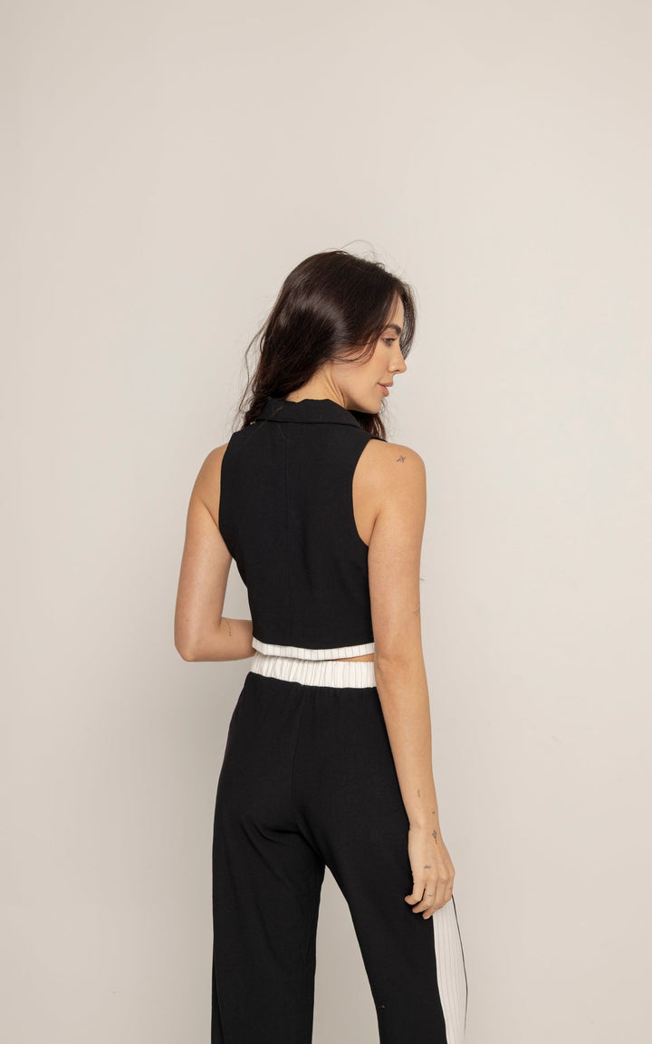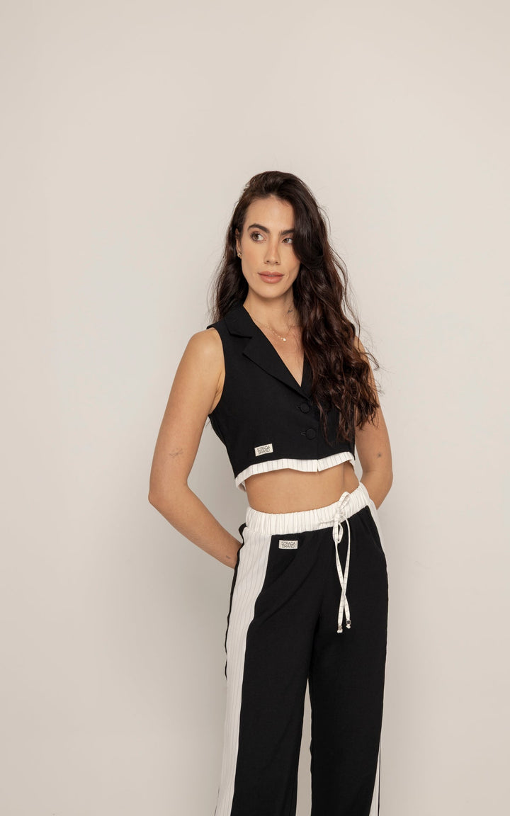 El Set Adela está compuesto por dos piezas: un chaleco tipo sastre sin mangas y un pantalón de silueta recta con pretina elástica y cordón ajustable. El top presenta cuello clásico, botones frontales y estructura entallada que realza el torso con un aire moderno. El pantalón, en contraste, incluye laterales en tono claro que estilizan visualmente la pierna y refuerzan la inspiración deportiva.