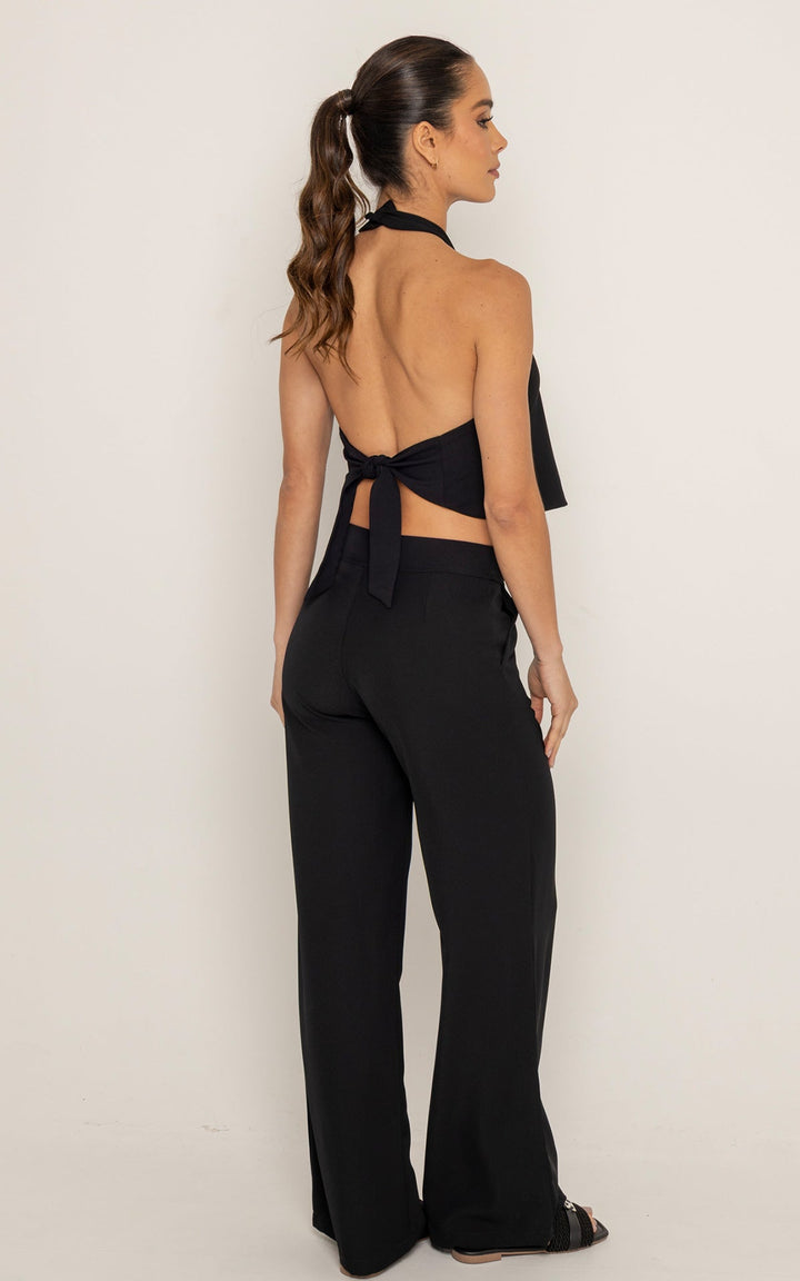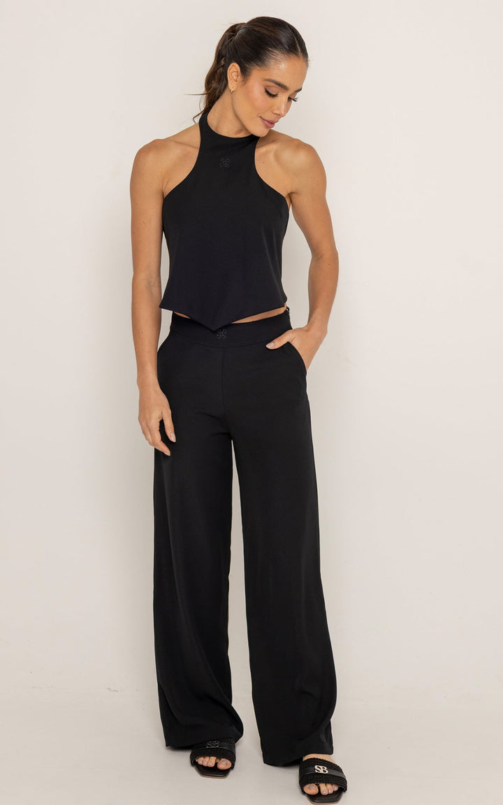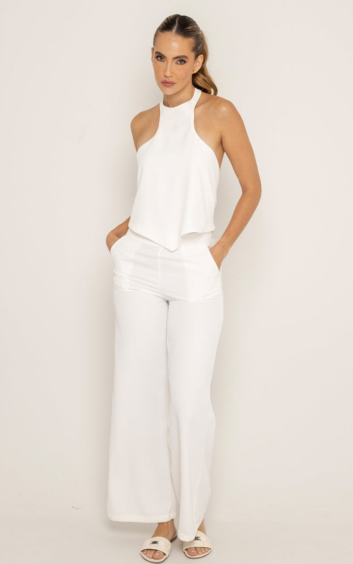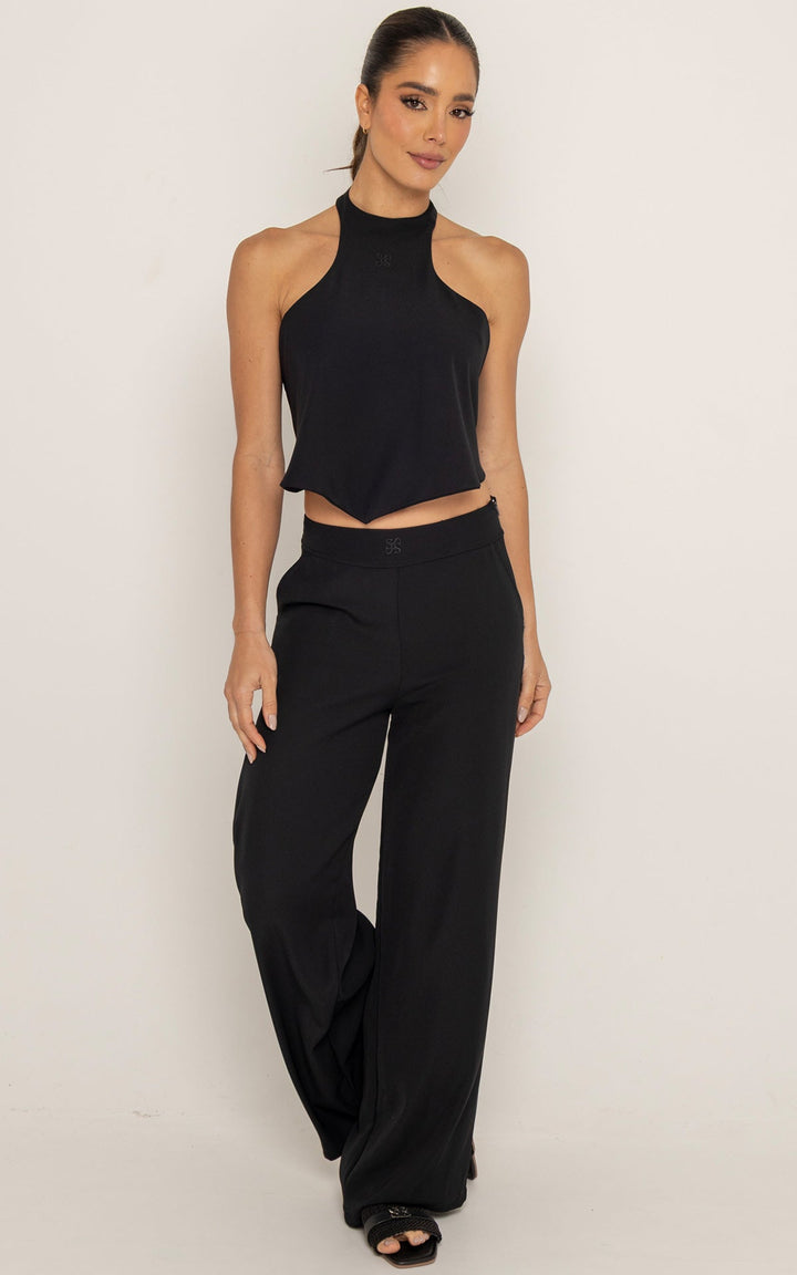 El diseño del top, con escote alto y espalda descubierta, aporta estructura y feminidad. El pantalón ofrece una silueta fluida que estiliza y alarga visualmente las piernas, manteniendo la comodidad durante todo el día.