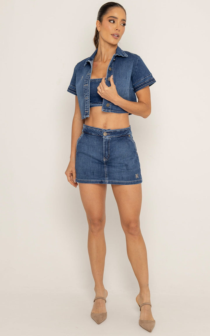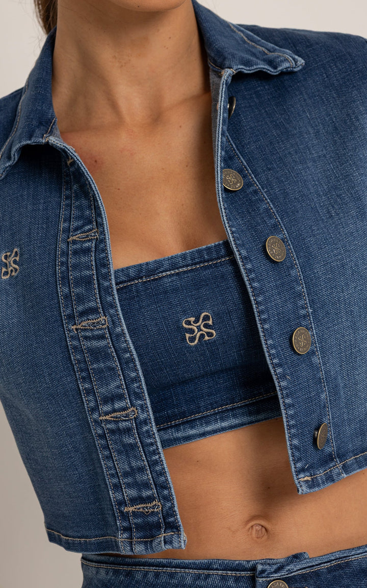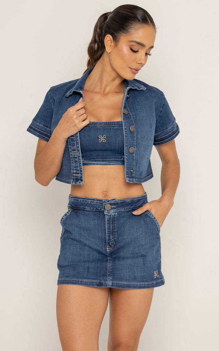 - Croptop: Denim elástico para un ajuste perfecto, con cierre frontal funcional y bordado central que realza su diseño.