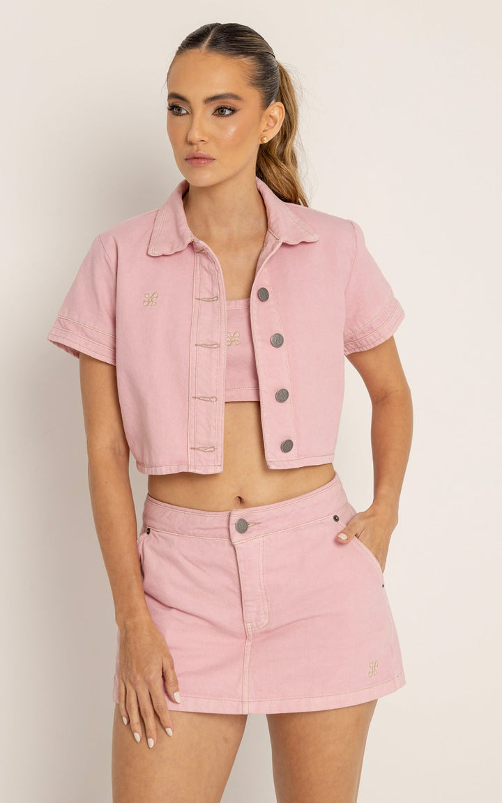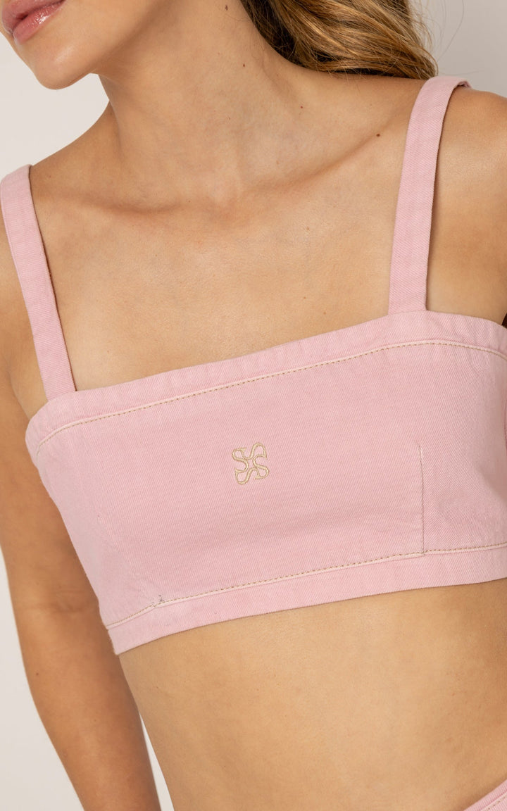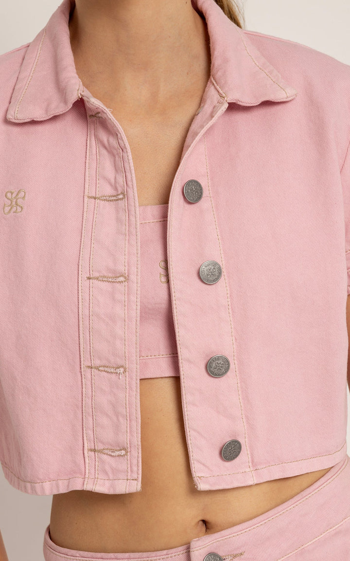 • Croptop: Denim elástico para un ajuste perfecto, con cierre frontal funcional y bordado central que realza su diseño.