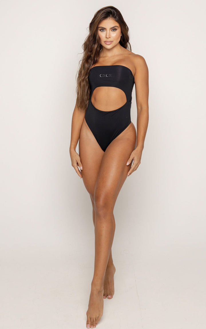 Clásico y magnético. Este traje de baño en negro profundo es una declaración de elegancia minimalista. El escote bandeau con cut-out centra la atención en la cintura y estiliza sin esfuerzo.