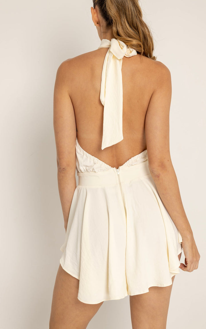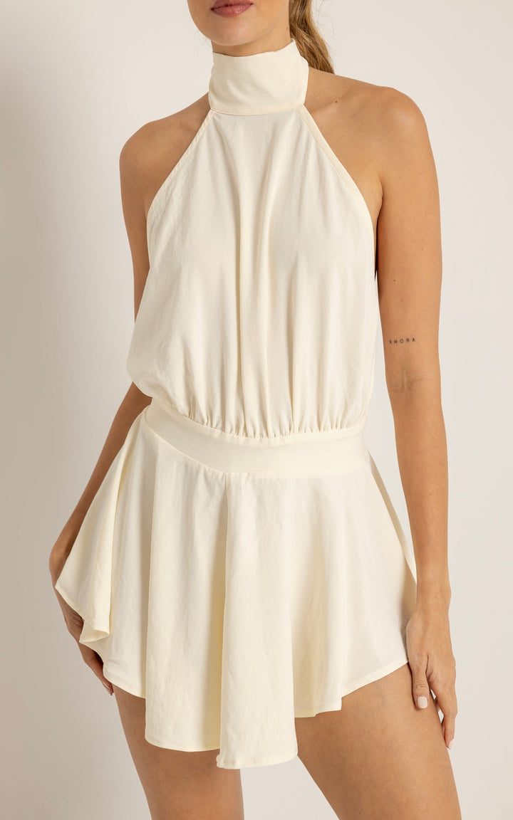 El Vestido Cosmos está confeccionado en una tela fluida y liviana que aporta movimiento y frescura. Su diseño tipo halter con cuello alto y espalda completamente descubierta crea una silueta estilizada y sofisticada, mientras que el cuerpo con efecto faldashort le brinda funcionalidad y seguridad al usarlo.
